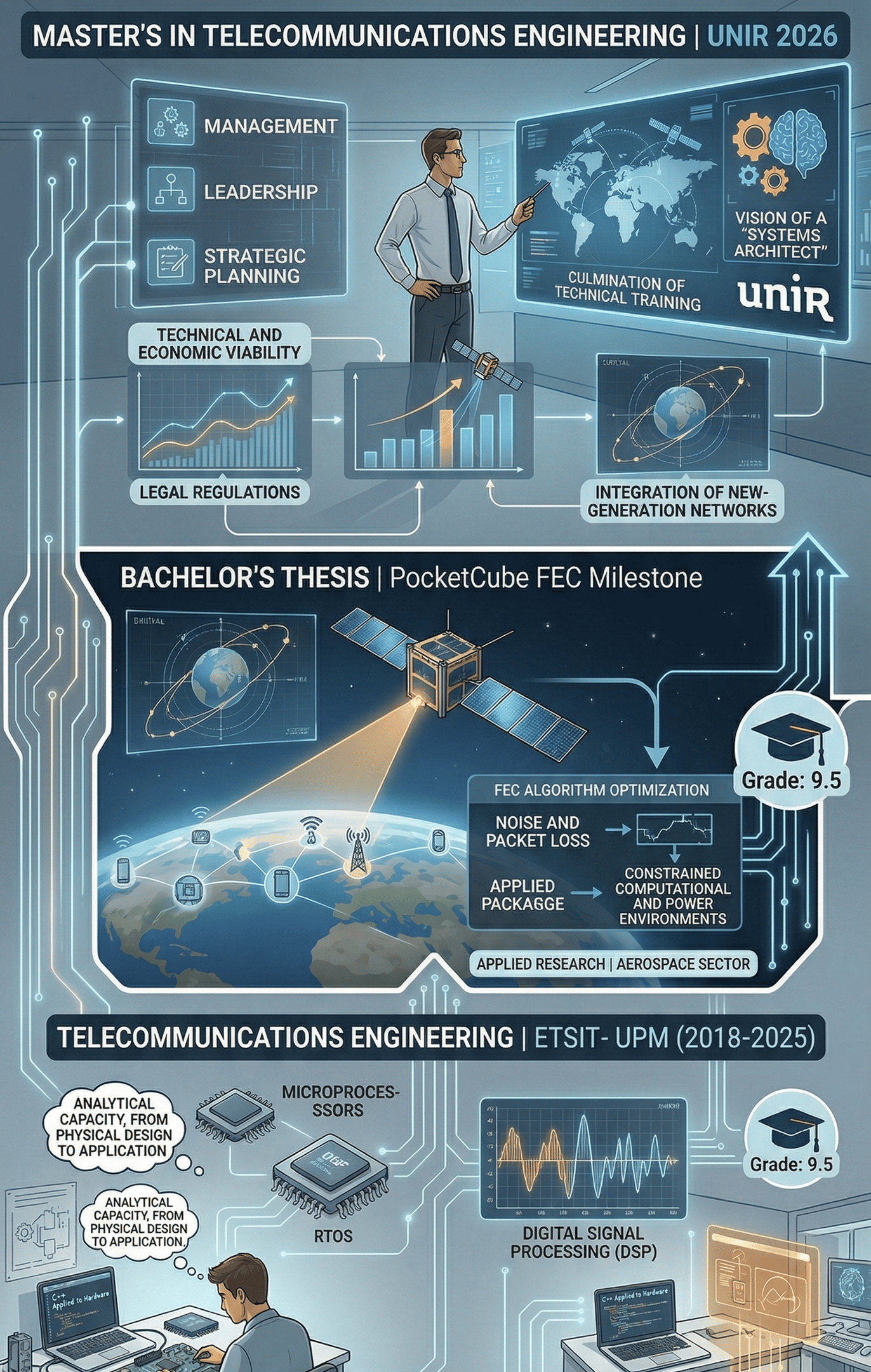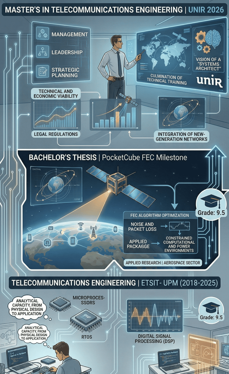 Mi paso por la "Teleco" en la UPM forjó mi capacidad analítica y mi base técnica en el diseño de sistemas de comunicación desde el nivel físico hasta el de aplicación.