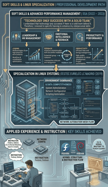 Experiencia Docente: Tras destacar como alumno, pasé a ser instructor de distribuciones como Fedora y Debian, lo que me obligó a dominar la CLI (línea de comandos) y la estructura del kernel para poder enseñarlo con claridad.