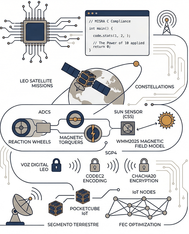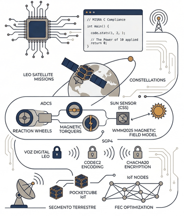 En el marco del proyecto DIANASAT, soy el responsable de verificar y rectificar protocolos de efemérides satelitales (SGP4) y solares (Vallado), así como modelos de campo magnético terrestre (WMM2025) para sistemas de control de actitud (ADCS). He diseñado algoritmos de determinación solar mediante el uso de sensores CSS, procesando sus señales a través del ADC para obtener una orientación precisa.