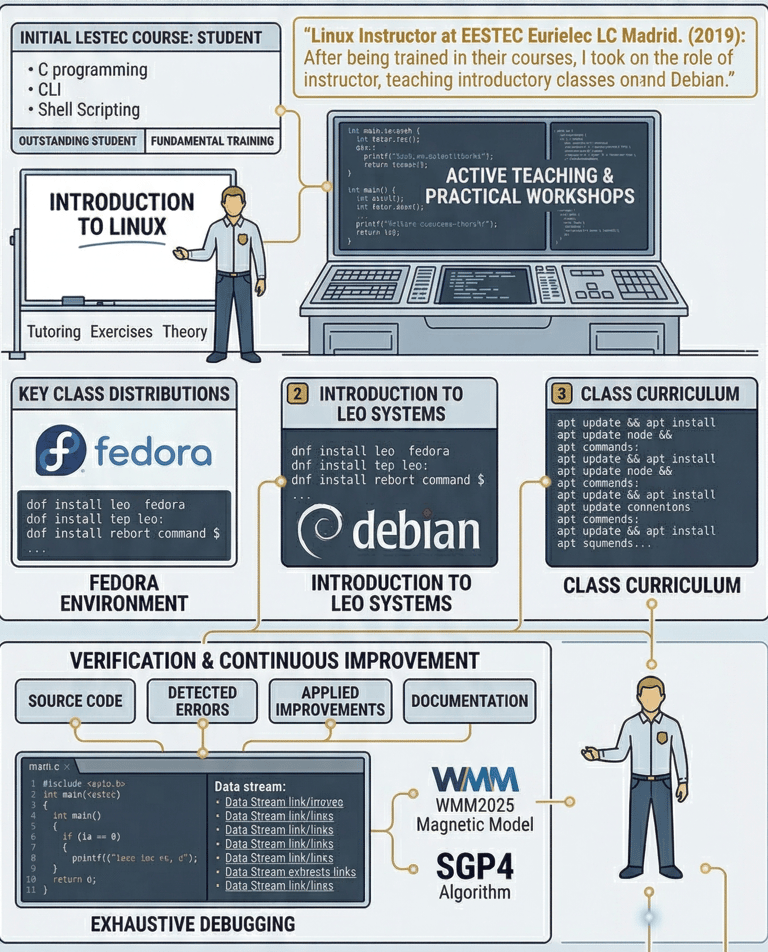 Inicié mi vínculo con EESTEC Eurielec LC Madrid como alumno de sus programas formativos, pero tras un proceso de desarrollo técnico destacado, asumí la responsabilidad de desempeñar el rol de instructor.